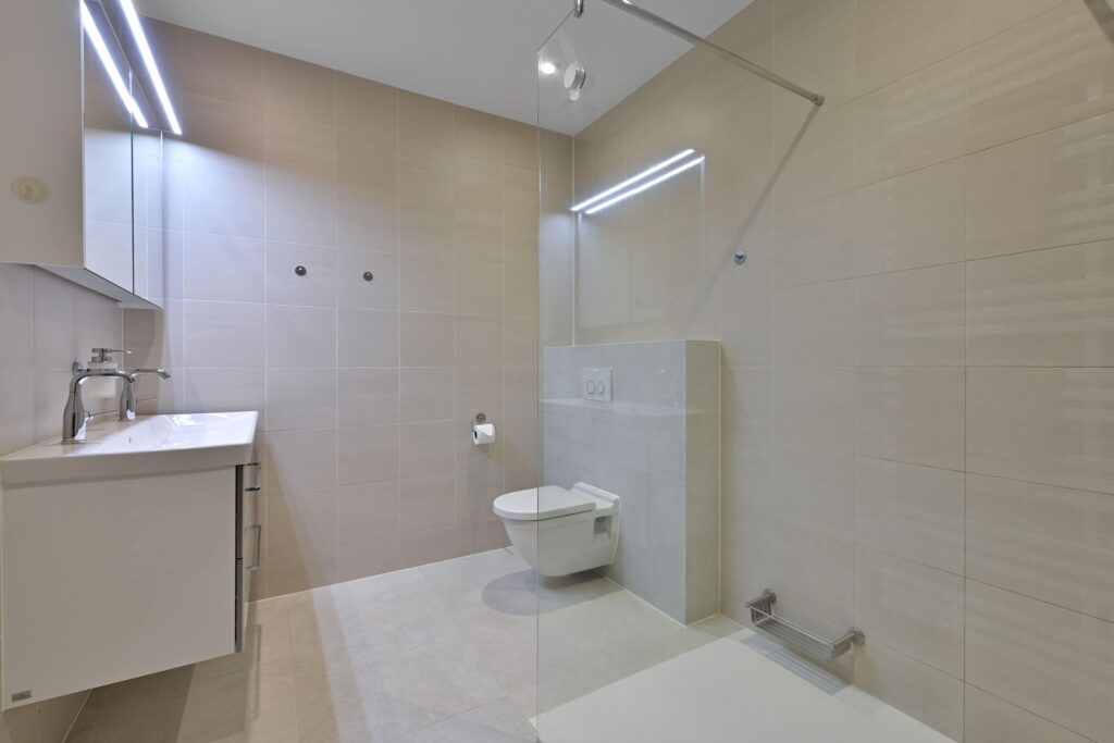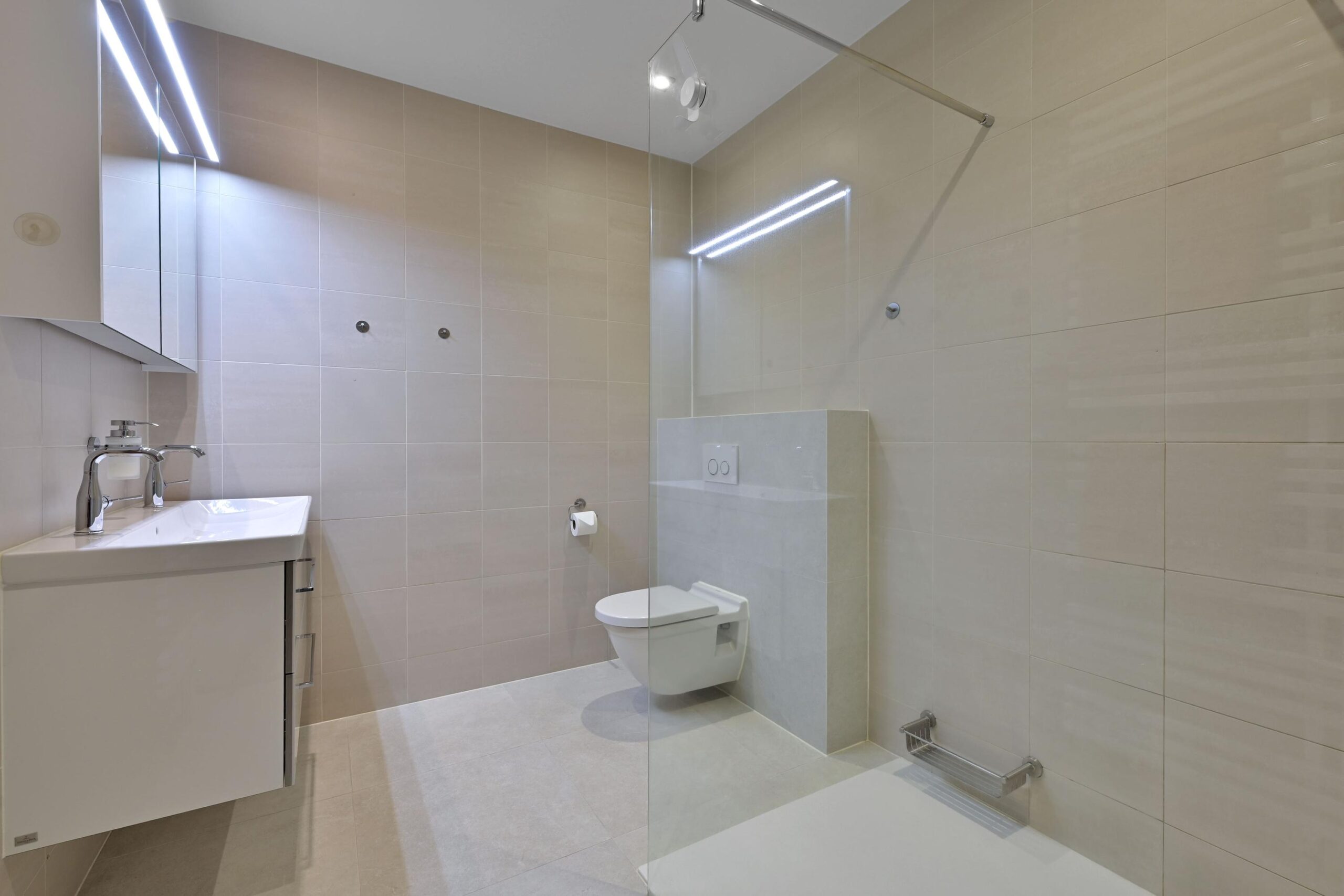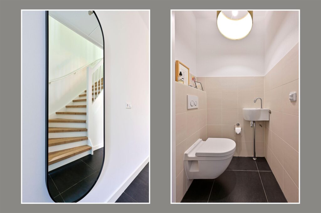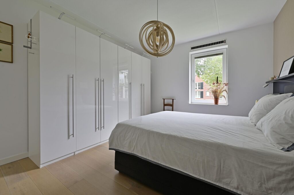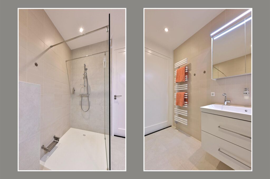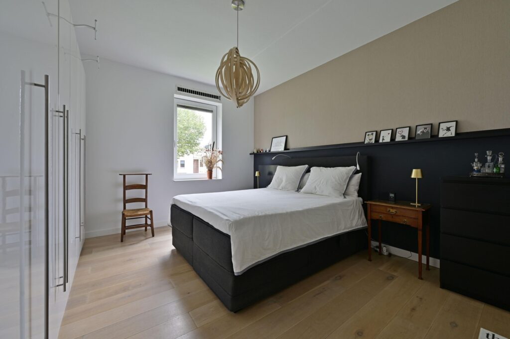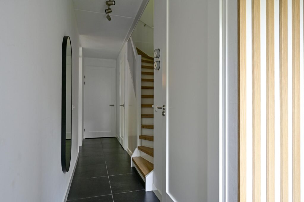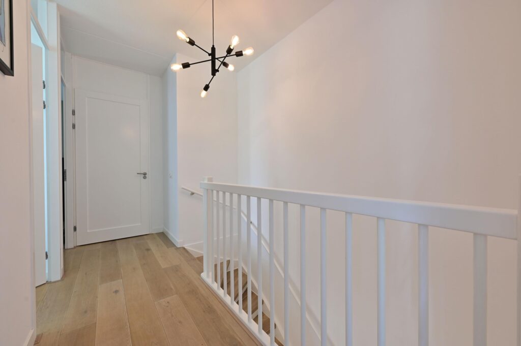 De overloop geeft toegang tot drie ruime slaapkamers en de moderne badkamer. De badkamer heeft een inloopdouche, 2e toilet, wastafelmeubel met dubbele kraan en is afgewerkt in neutrale kleurstelling. Alle slaapkamers zijn voorzien van lichte houten vloerdelen en vouwgordijnen.
