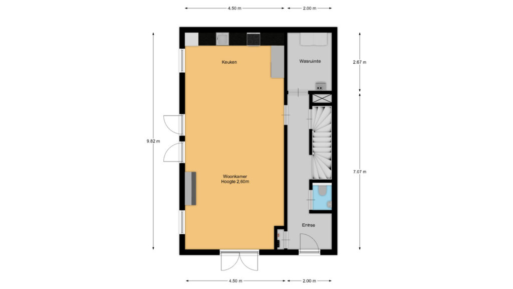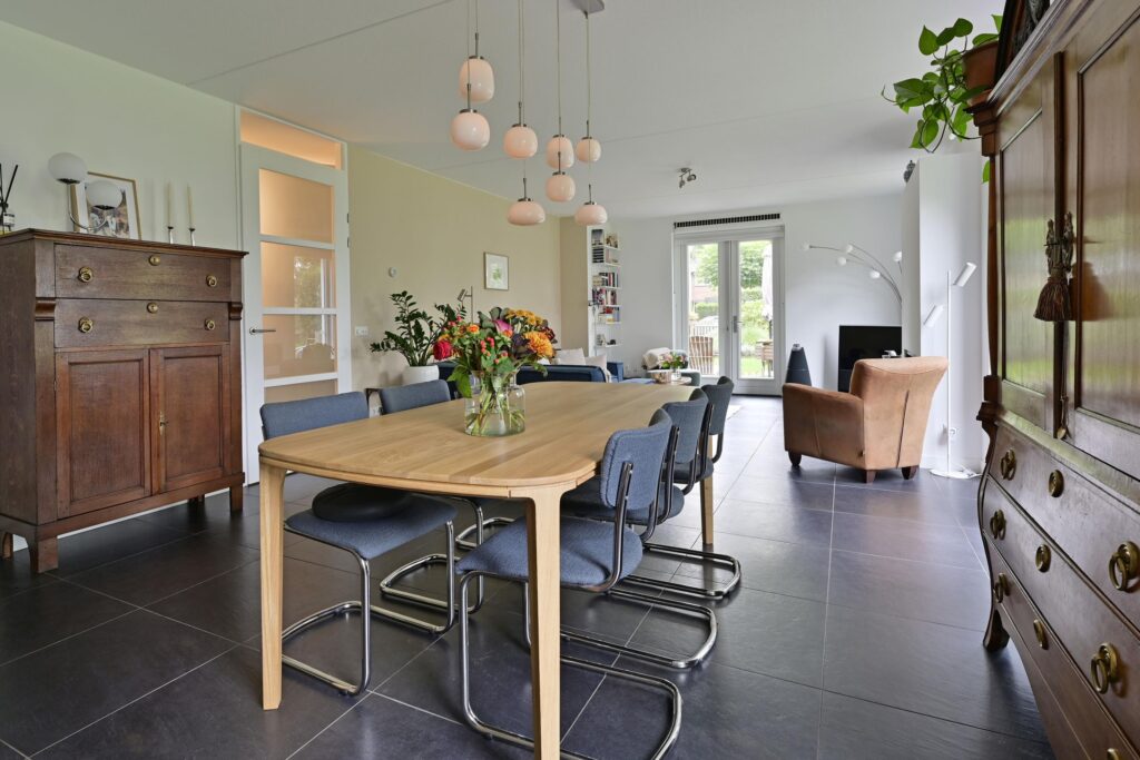 Het woonhuis heeft op de begane grond zijn eigen entree, meterkast, hal en modern toilet met fonteintje. Vanuit de hal komt men in de woon-eetkamer en in de royale was-bergruimte met wasmachine en droger aansluiting. De royale lichte woon-eetkamer heeft een open keuken en openslaande deuren naar de fraai aangelegde tuin. De moderne keuken (2024) is voorzien van compleet inbouwapparatuur; afwasmachine, ingebouwde ijskast, combi oven, hete luchtoven (allen Miele), inductiekookplaat (Bora) met afzuigsysteem en een Quooker kraan.
