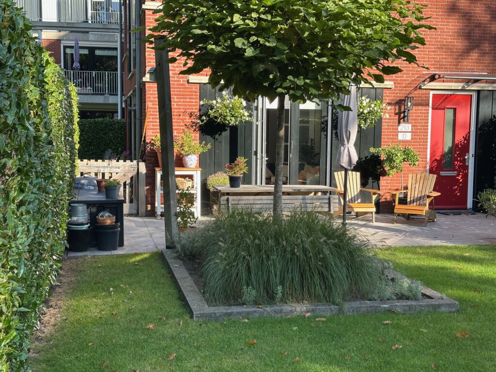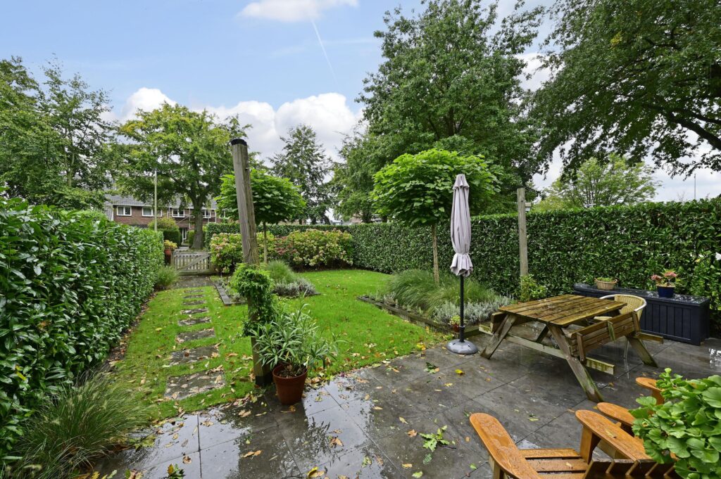 De tuin is maar liefst 14 meter diep, is fraai aangelegd en bereikbaar via de openslaande deuren vanuit de woonkamer. De gehele dag kan men er zon vinden. Aan de zijkant van het woonhuis is er nog een heerlijk borrelterras gelegen op het westen, ideaal om van de allerlaatste zonnestralen te genieten.