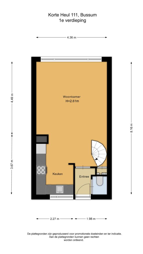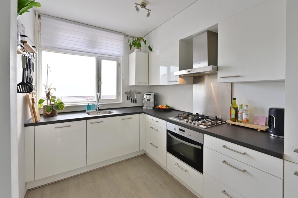 Entree/hal, eenvoudig net toilet, royale en lichte woon-/eetkamer met moderne halfopen keuken welke is voorzien van diverse inbouwapparatuur (gaskookplaat, oven, afzuigkap, vaatwasser en koelkast). Bij de keuken is een gezellige eetbar gesitueerd.