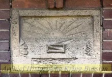 • Voordeur in het midden van het woonhuis met daarboven de gevelsteen (opkomende zon);