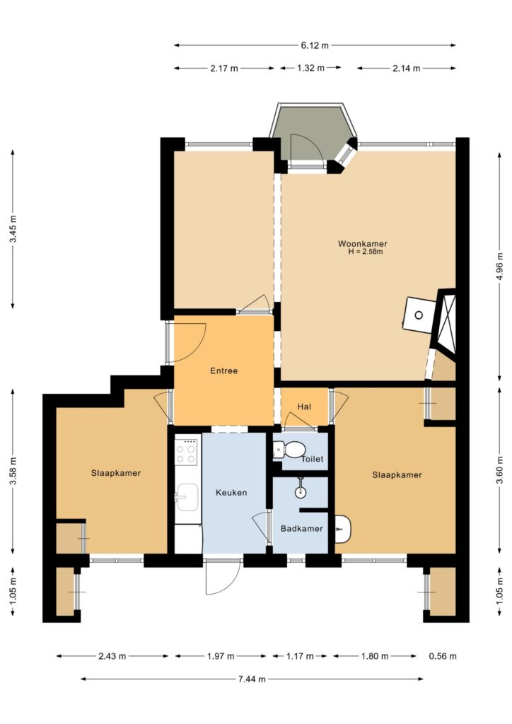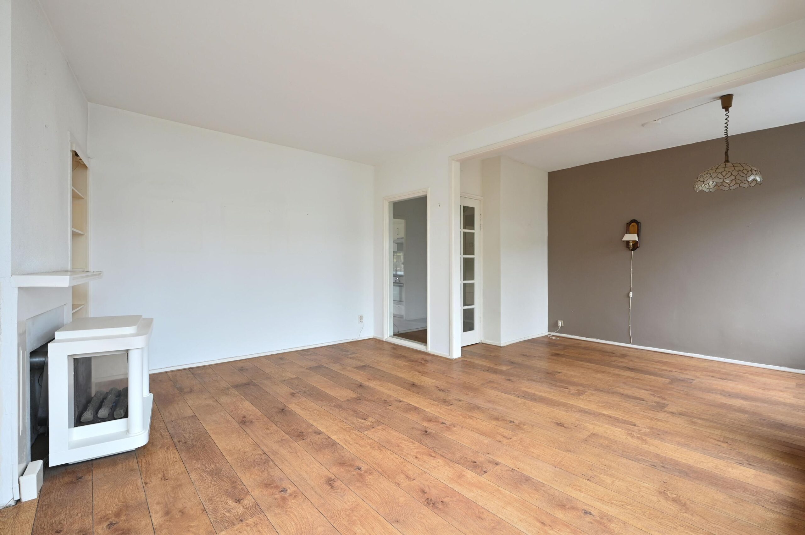 Entree, hal, toilet, L-vormige woonkamer met laminaatvloer en openslaande deur naar het klein balkonnetje op westen. Moderne eenvoudige keuken voorzien van inbouwapparatuur, toilet, 1e ruime slaapkamer met laminaatvloer en vaste kast, gemoderniseerde badkamer met douche, 2e slaapkamer met laminaatvloer en vaste kast.