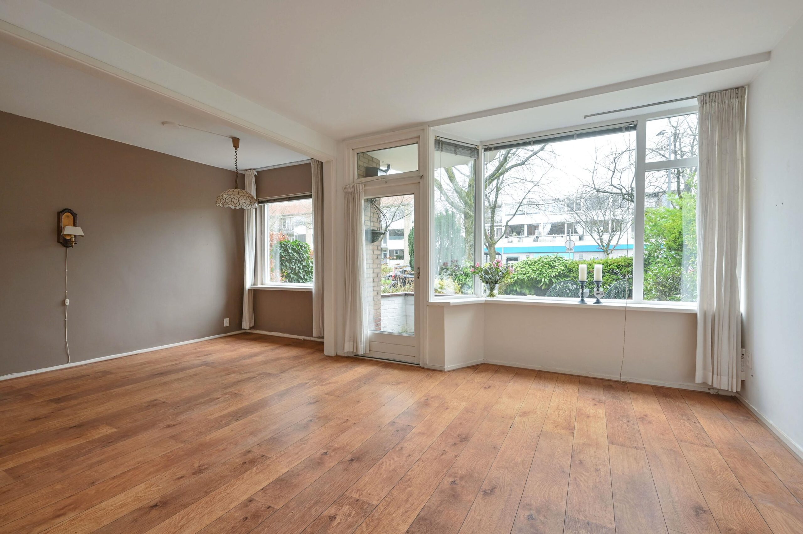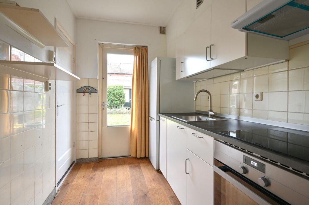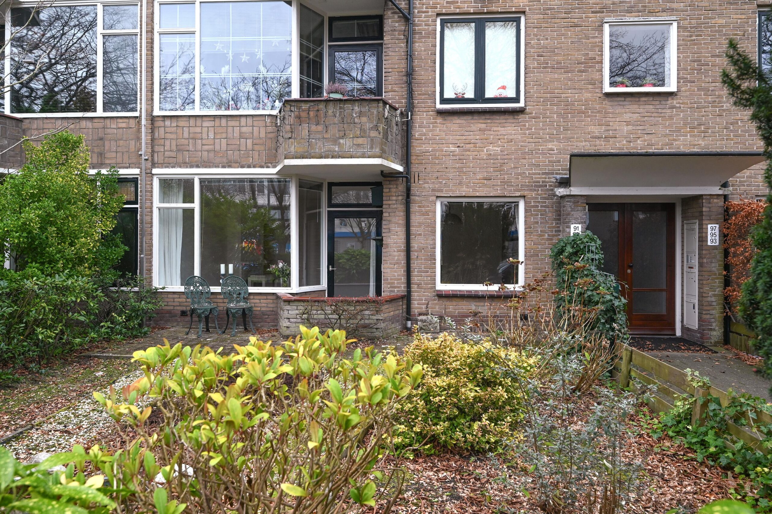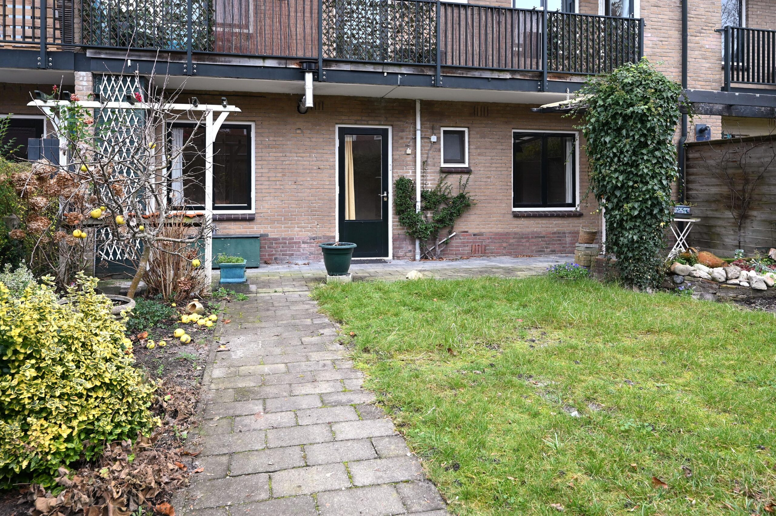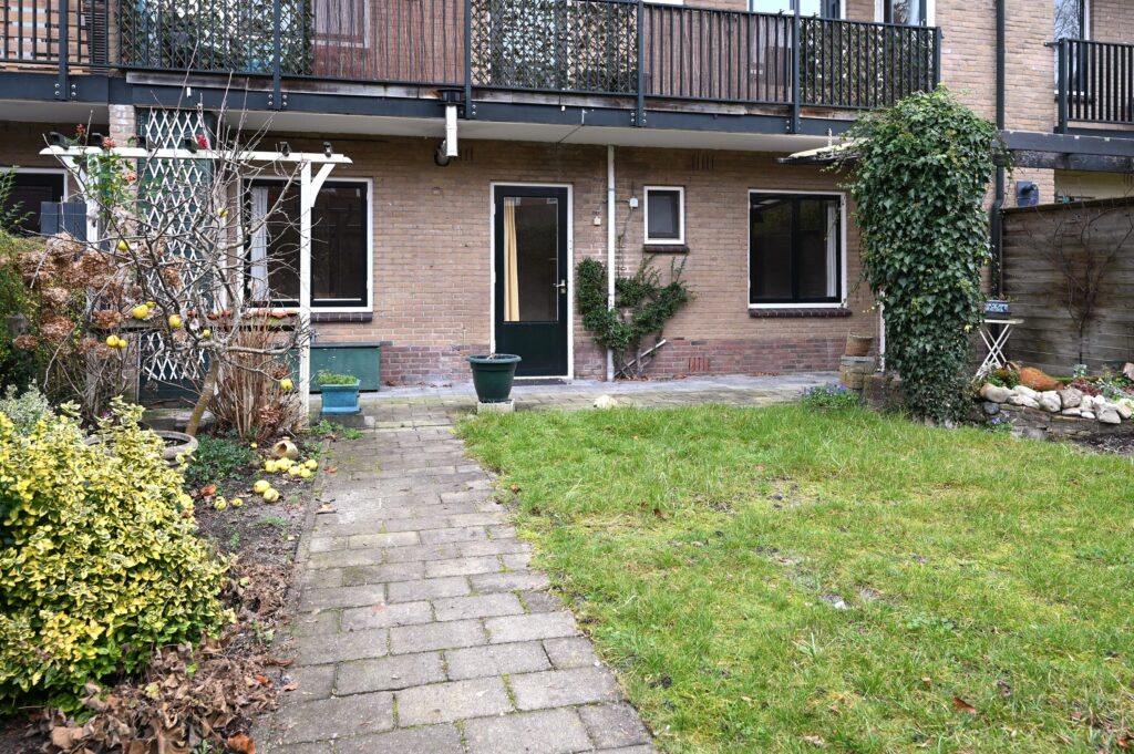 Aan plantsoen op de begane grond gelegen drie kamer-appartement met stenen schuur, voor- en diepe achtertuin op het zuidoosten.