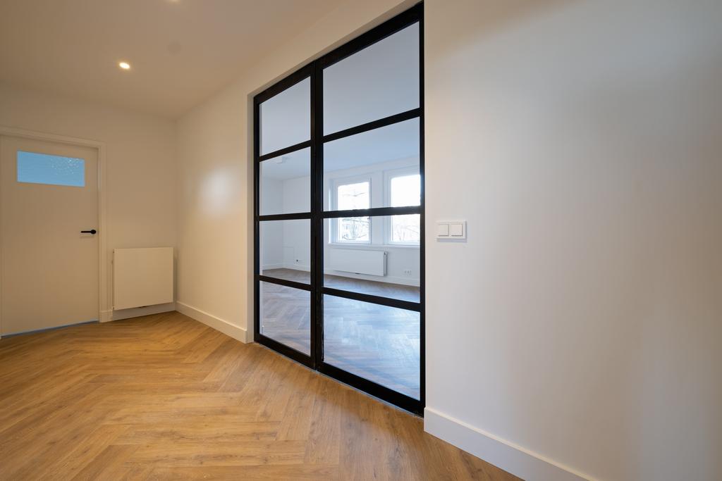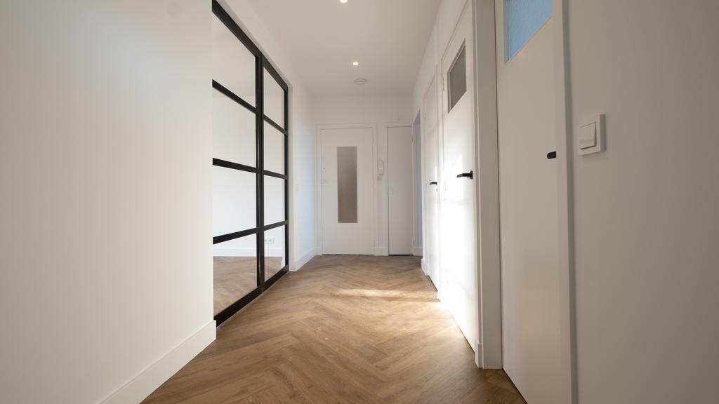 Ruime hal met wc en aparte ruimte voor wasmachine en droger, via dubbele taatsdeuren naar ruime en lichte woonkamer (voorheen 2 kamers) over de gehele breedte van het appartement, moderne luxe keuken voorzien van compleet inbouwapparatuur, hierin de toegang tot de moderne badkamer met wastafelmeubel en douche, 1e royale slaapkamer (14 m²) en een 2e slaap-/werkkamer (9 m²),