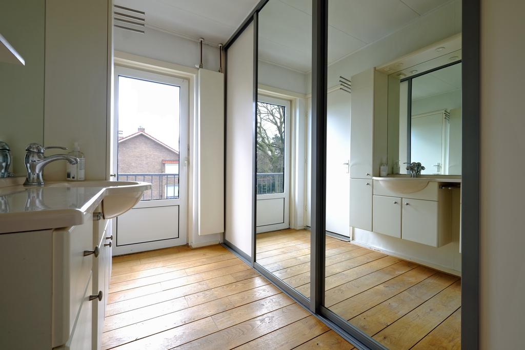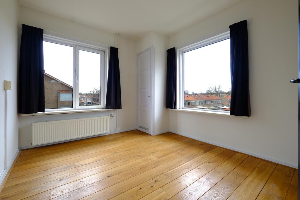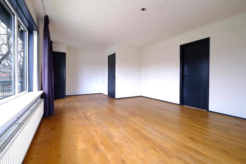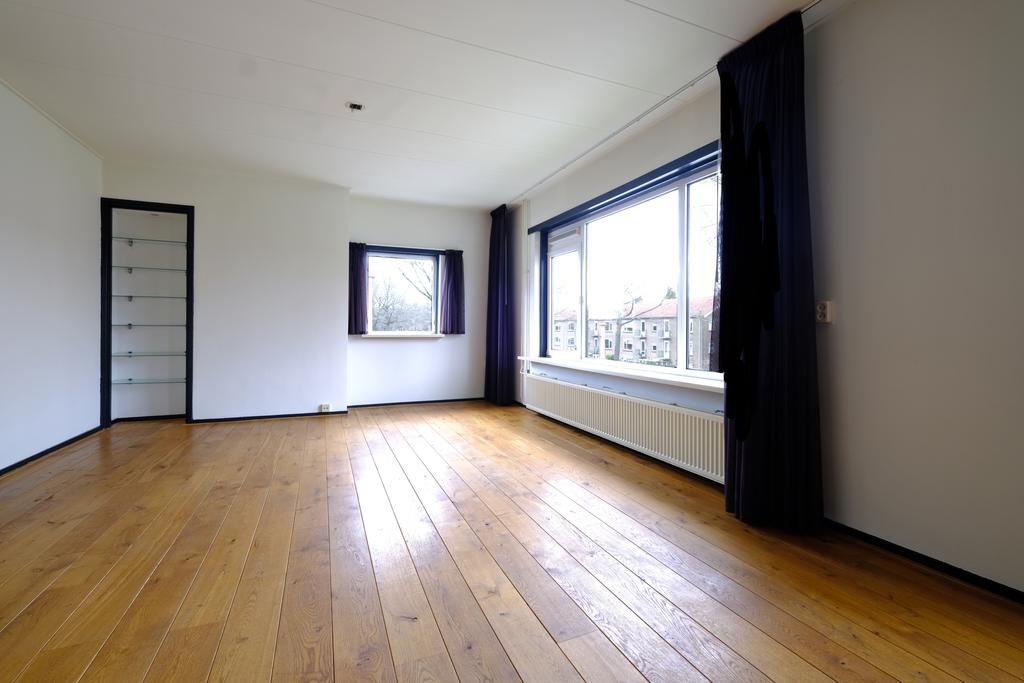 Wonen op loopafstand van de heide en binnen 10 minuten van het station, mediapark en snelweg A-1! 3-kamer-appartement met balkon op het westen en bovengelegen bergzolder. In de achterbouw bevindt zich een eigen berging.