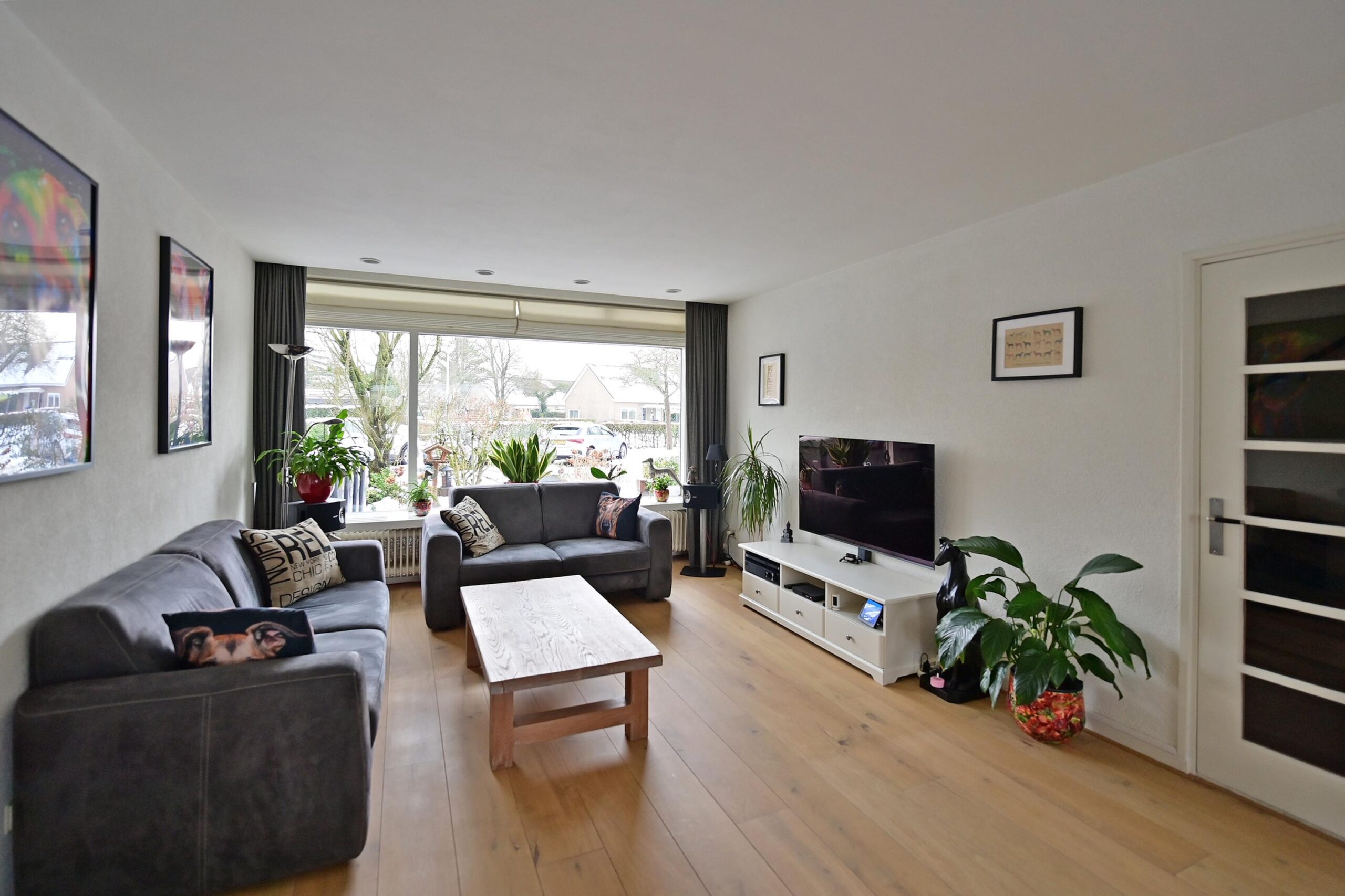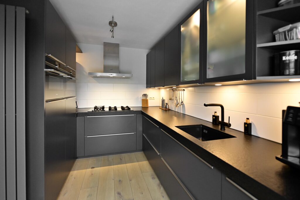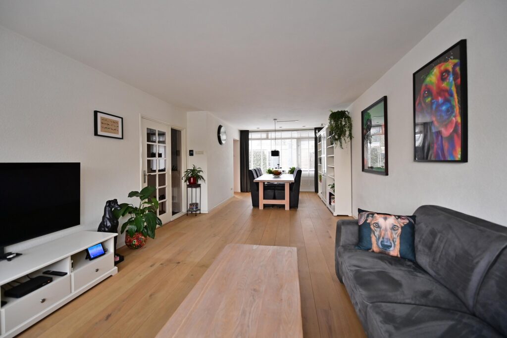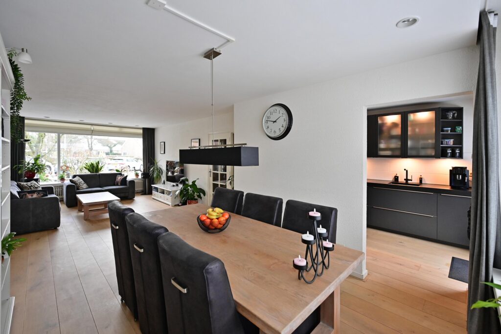 Entree, tochthal met meterkast, gang, modern zwevend toilet met fonteintje, gangkast, ruime woonkamer met eiken houten vloerdelen en deur naar achtertuin, doorloop naar moderne keuken met vaatwasser, 5 pits gaskookplaat, afzuigkap, oven, combi/magnetron, koelkast en vriezer. Het aanrechtblad is van graniet.